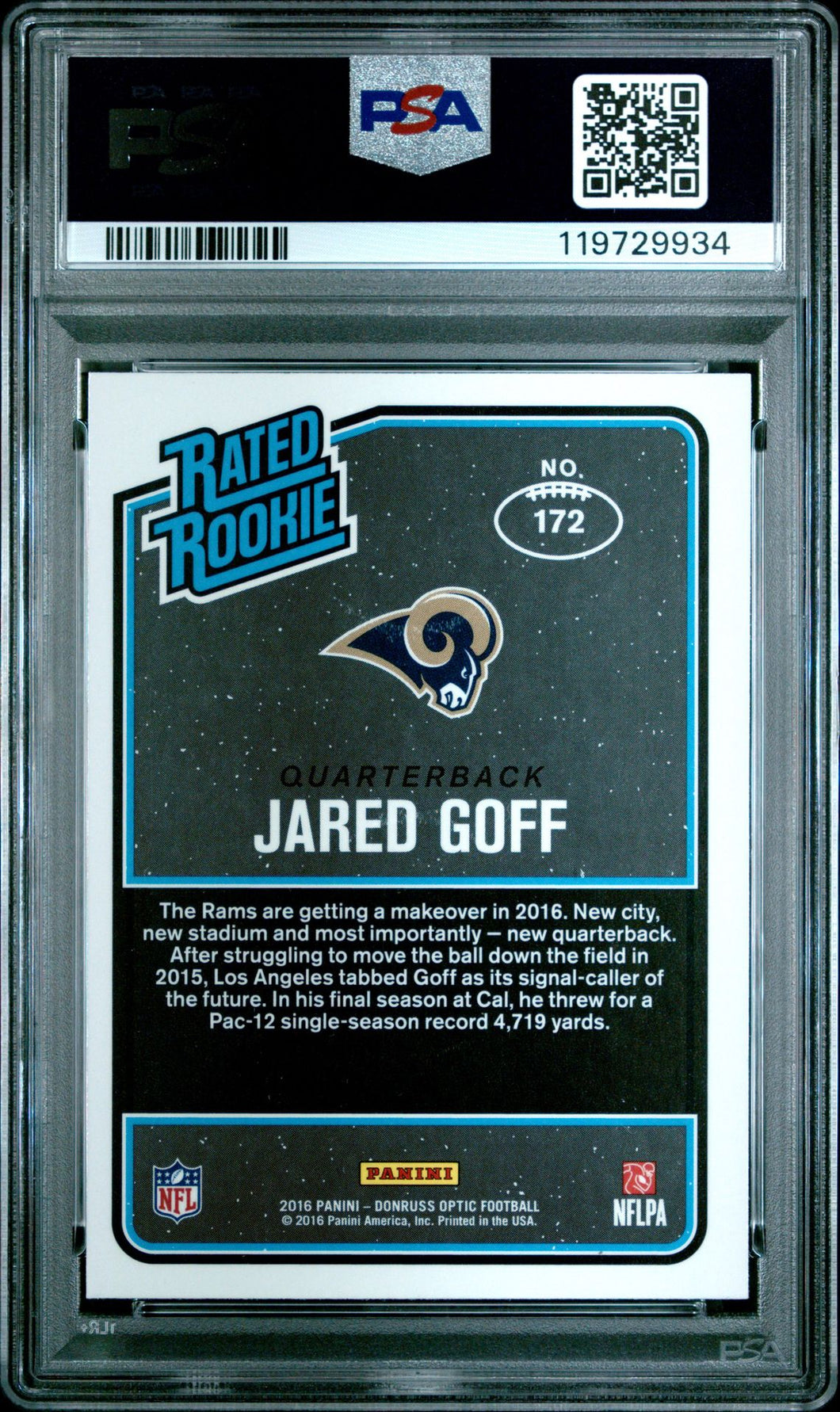 2016 Panini Donruss Optic Football Card Jared Goff Purple Holo Prizm RC #172 PSA 10